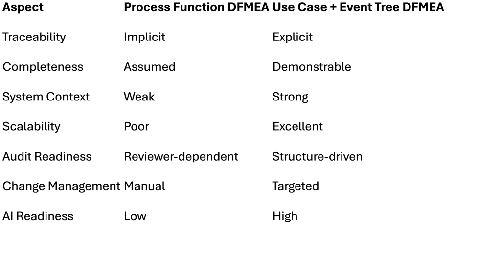 Organizing DFMEA by process function is no longer sufficient for modern medical devices. A Use Case– and Event Tree–based DFMEA restores system intent, strengthens traceability, and aligns DFMEA with how regulators, engineers, and—soon—AI systems reason about risk.