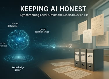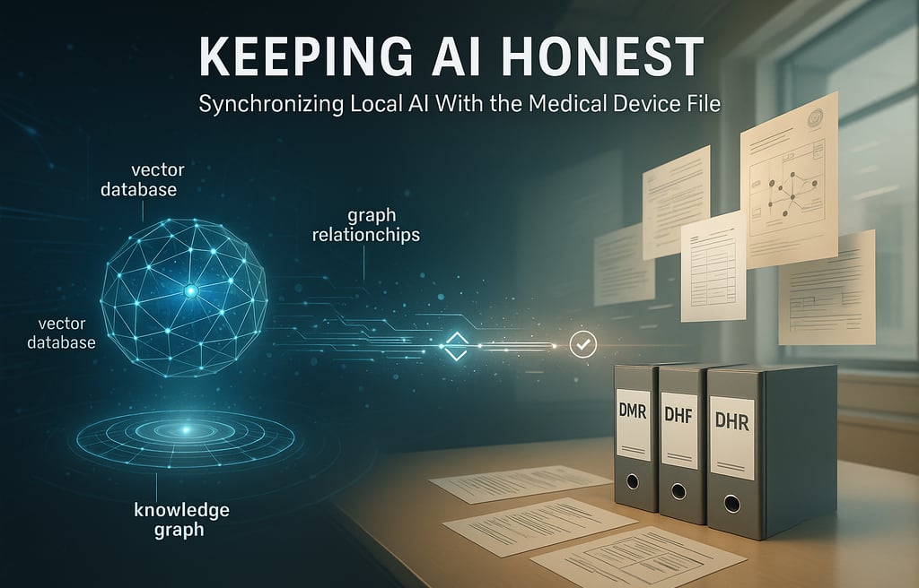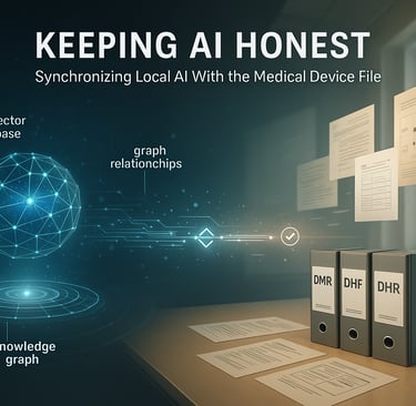 Local AI systems promise improved security, full traceability, and a higher level of control. But achieving those promises requires solving one of the most underrated challenges in AI governance: keeping the AI data layer synchronized with the authoritative Document Control System and the Medical Device File (MDF). Under ISO 13485 and the new Quality Management System Regulation, the MDF is the combined truth of the device, merging the Device Master Record, Design History File, and Device History Record. Any AI system that relies on stale representations of this information risks undermining the integrity of downstream decision making.