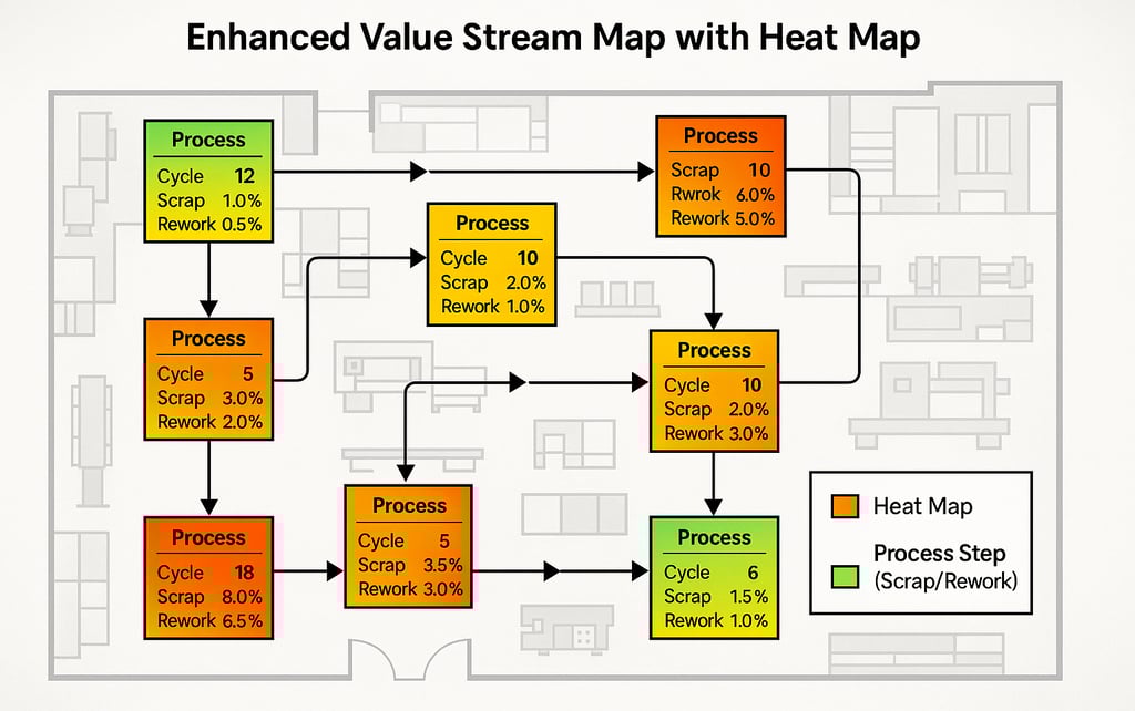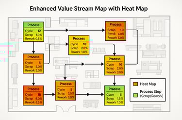 When overlaid on a plant layout, EVSM can be visualized as a heat map of operational risk and quality loss. Areas with elevated scrap or rework concentrations are no longer anecdotal. They are structurally mapped.